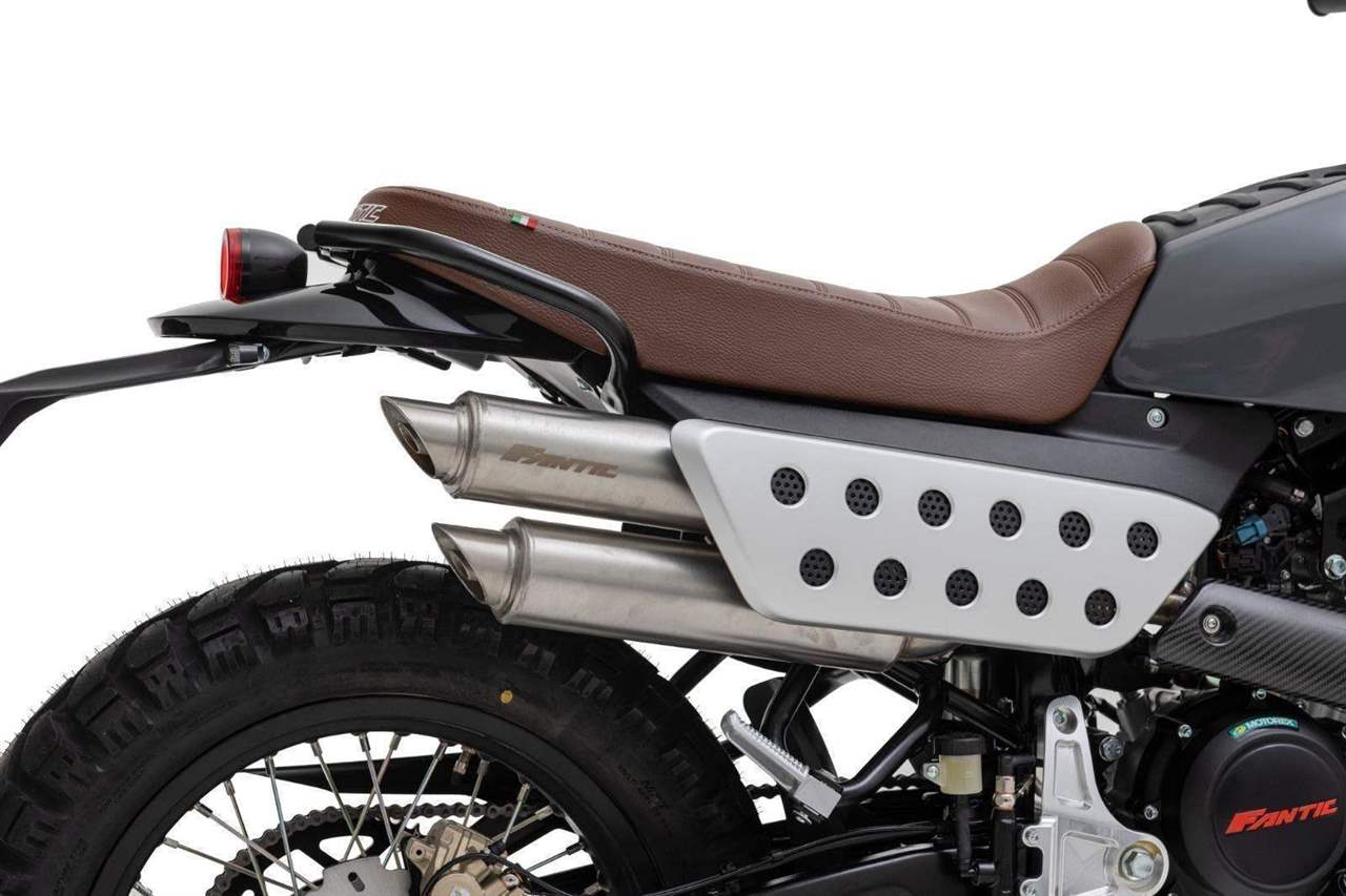 Přední 41mm USD vidlice FANTIC FRS má zdvih 150 mm, zadní odpružení se stejným zdvihem je také tovární FANTIC FSR. U verze Scrambler je nastavitelný odskok u zadního tlumiče.
