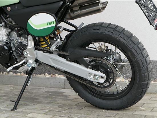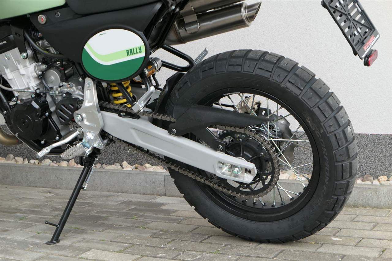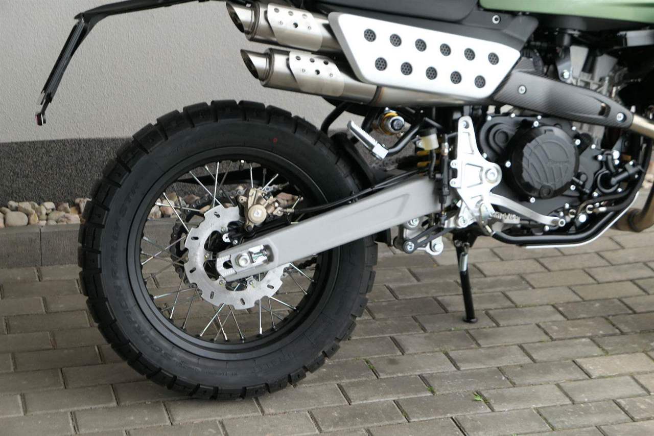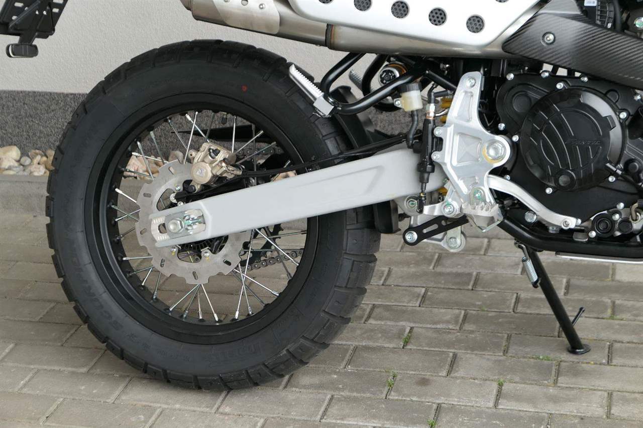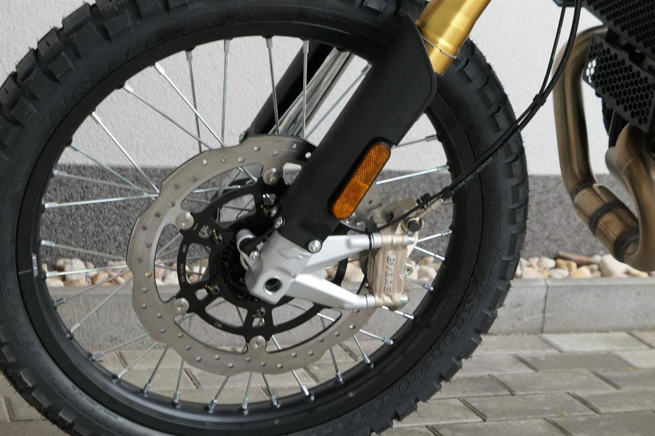 Jeho off-roadová konfigurace — obsahující 43mm plně nastavitelné odpružení se zvětšeným zdvihem, vysoko umístěný přední blatník, kyvnou vidlici z hliníkové slitiny s variabilním průřezem a progresivní přepákování — z něj dělá ideálního společníka pro jezdce, kteří hledají intenzivní zážitky a dobrodružství. Dominantním prvkem verze Rally je 21" přední kolo, které zaručuje špičkové off-roadové vlastnosti.
