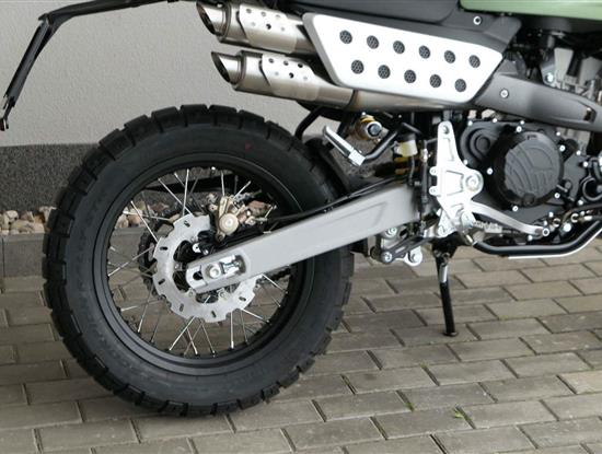 Klíčovým prvkem konstrukce je odpružení s dlouhým zdvihem — 200 mm vpředu i vzadu. Nový model vyniká řadou terénních vylepšení, mezi něž patří nová zadní pružina s předpětím optimalizovaným pro off-road, vylepšená hydraulická vidlice, propracovaný systém lamel a speciální off-roadové osvětlení.