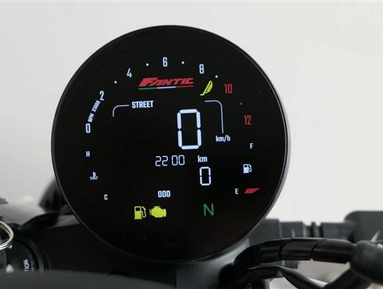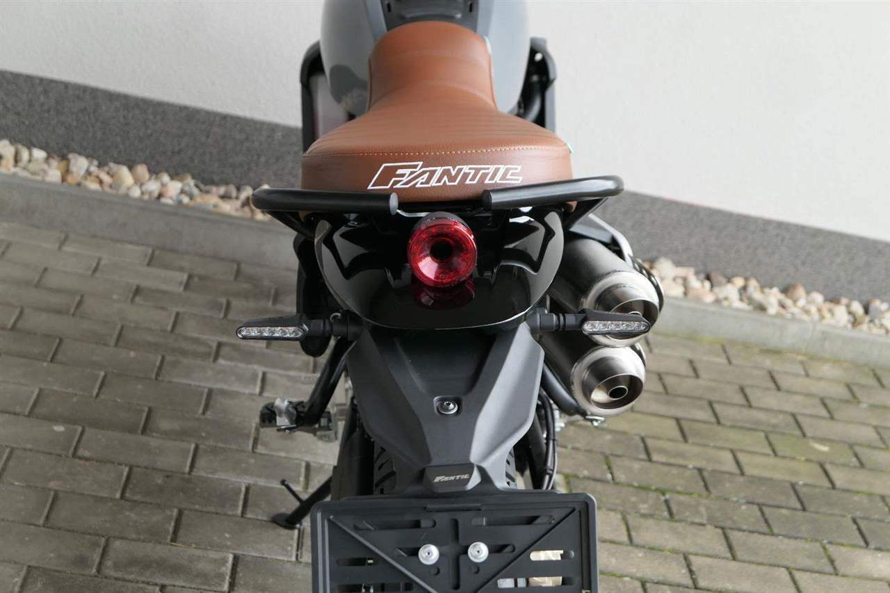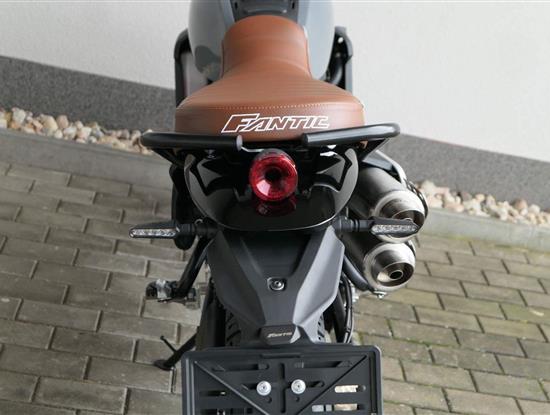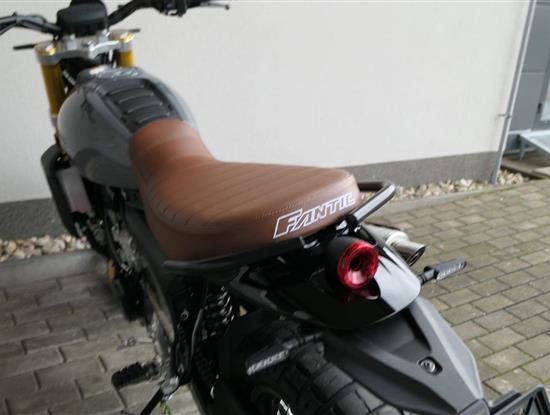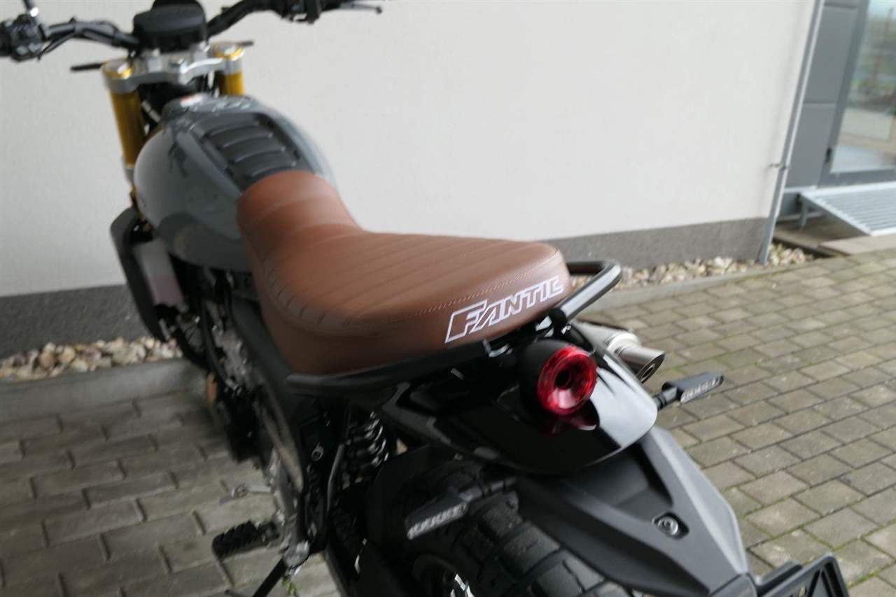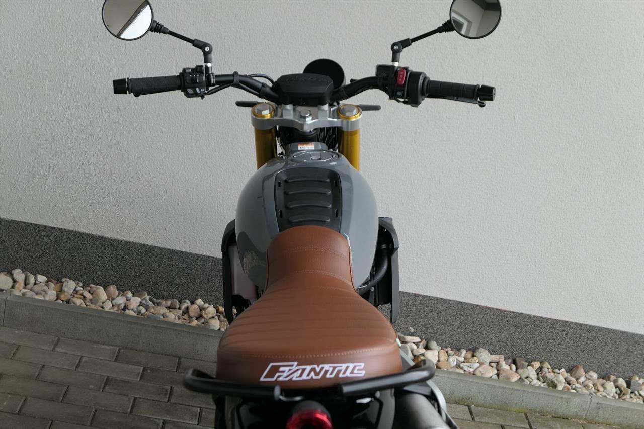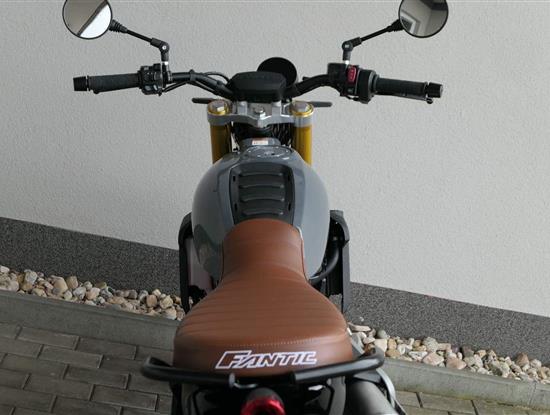 Přední 41mm USD vidlice FANTIC FRS má zdvih 150 mm, zadní odpružení se stejným zdvihem je také tovární FANTIC FSR. U verze Scrambler je nastavitelný odskok u zadního tlumiče.