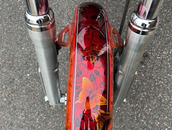 Přední chorovaný padací rám a chromovaný nosič na zadním blatníku.