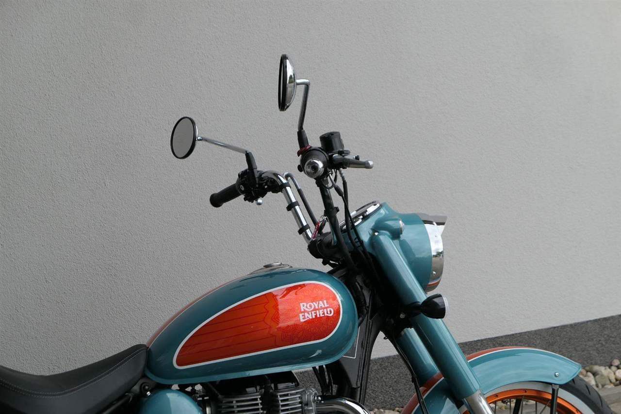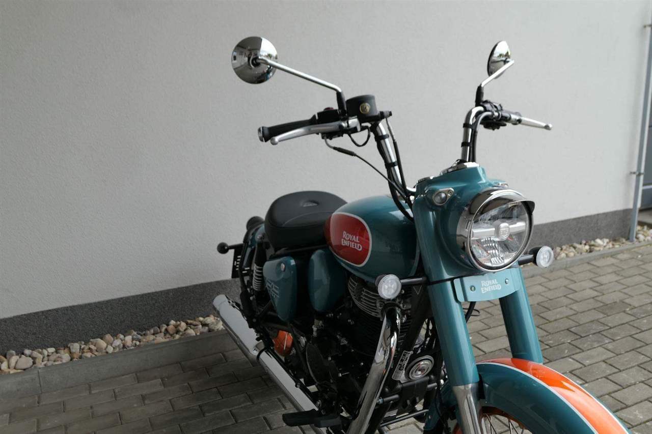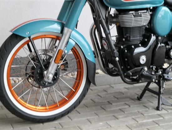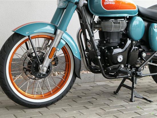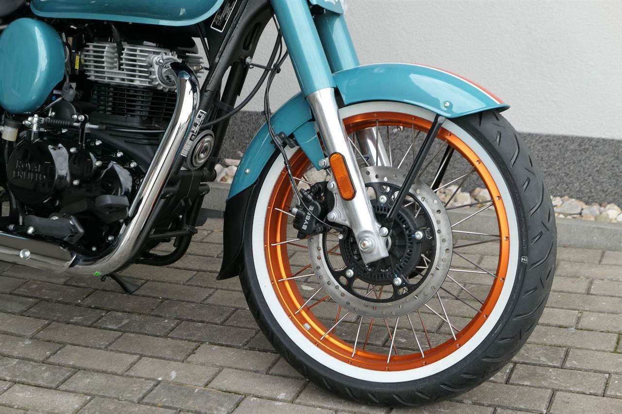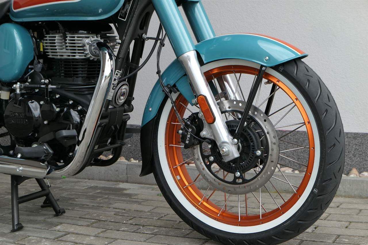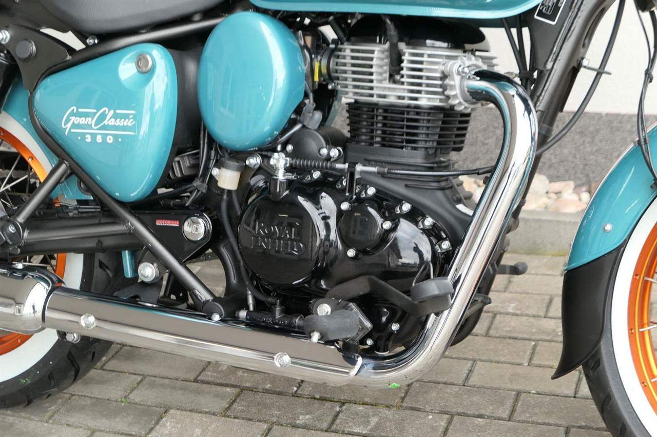 - Osvědčený motor 350 cm³ (J-platforma) – kultivovaný chod, spolehlivost a typický zvuk Royal Enfield