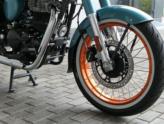 Kola: hliníkové ráfky s výplety a bezdušovými pneumatikami s bílým bokem, přední 19", zadní 16".