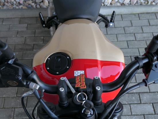 Celkově má Guerilla poměrně moderní tvary, Royal ale zdůrazňuje, že zde nejsou žádné nadbytečné plasty a serepetičky, a že jde v principu o jednoduchou a zábavnou motorku – což koneckonců spojuje všechny modely Royal Enfieldu. Opět je nutné pochválit výběr barev, který je vychytaný přesně tak, jak jsme u Royalu zvyklí. Z celkem pěti zbarvení je jenom jedno nudné, a sice jednolitá stříbrná Smoke Silver. Zbytek, tedy Brava Blue, Yellow Ribbon, Playa Black a Gold Dip zajímavě kombinují barevnou grafiku a ve třech případech dostanete i barevné ráfky.