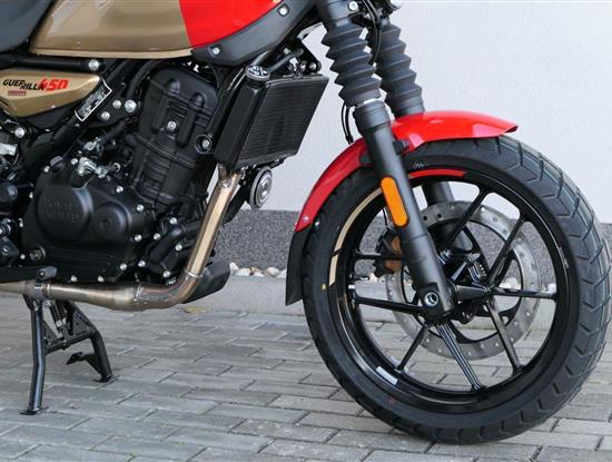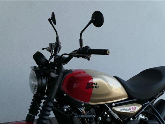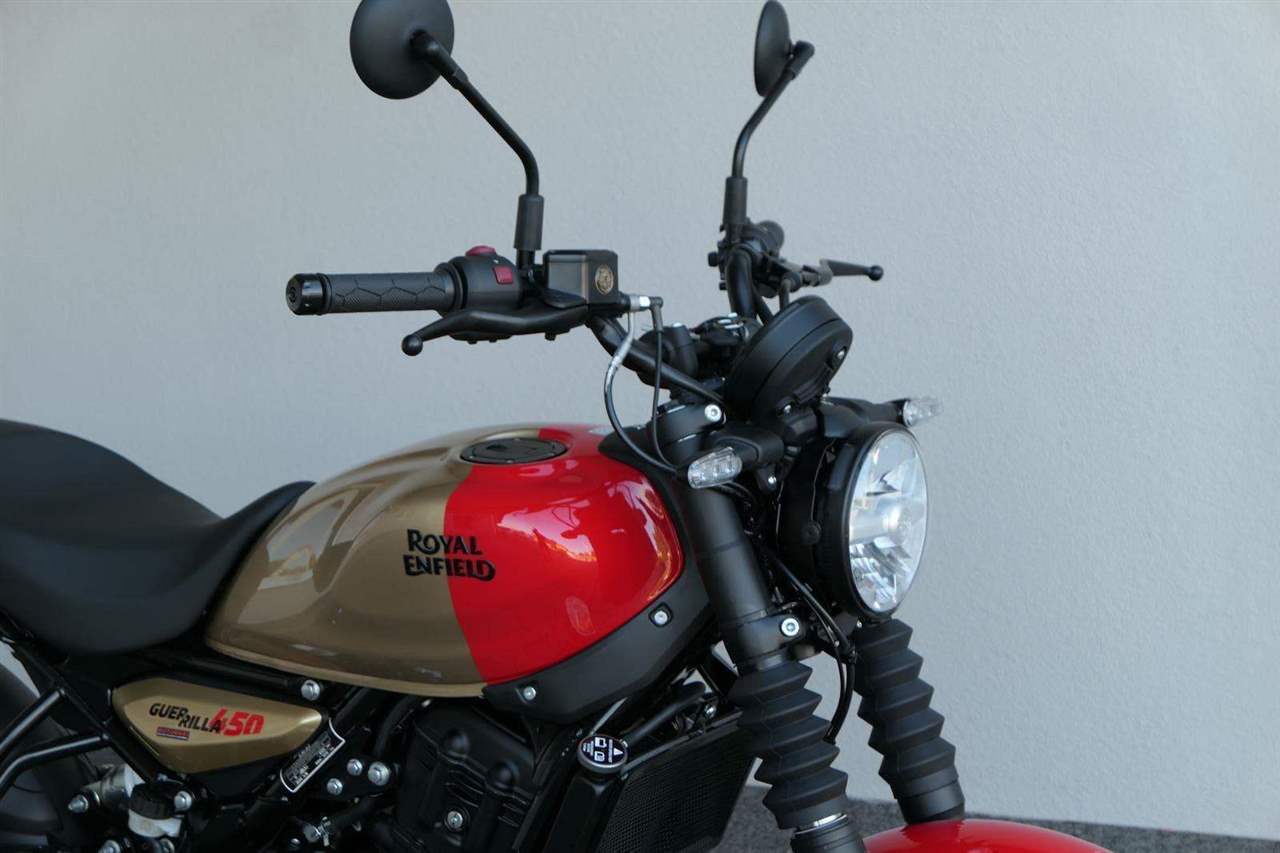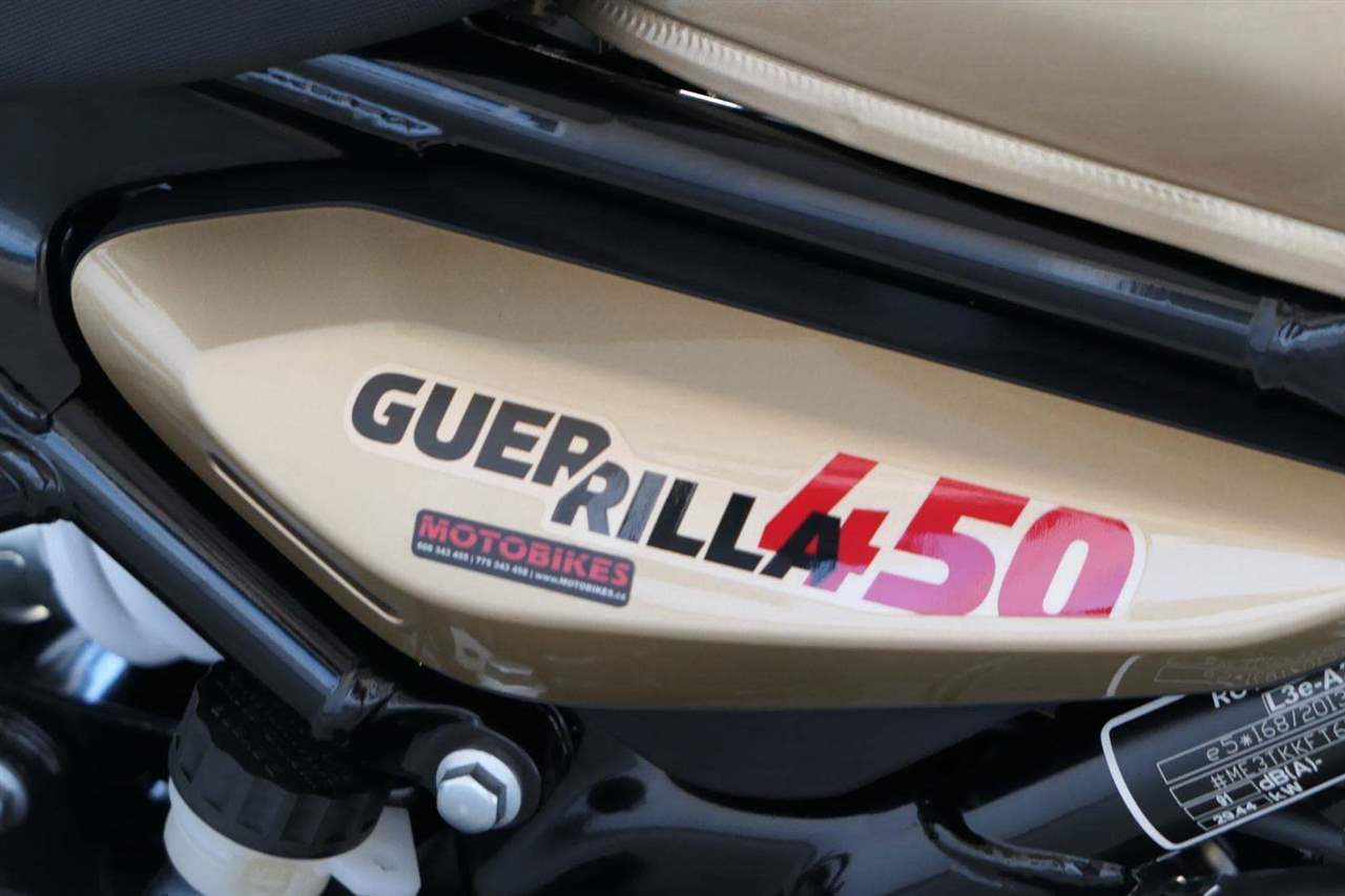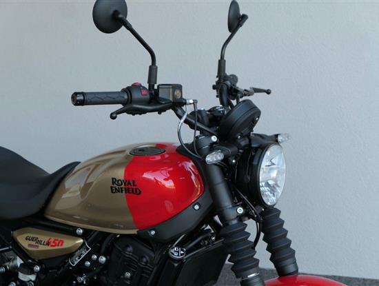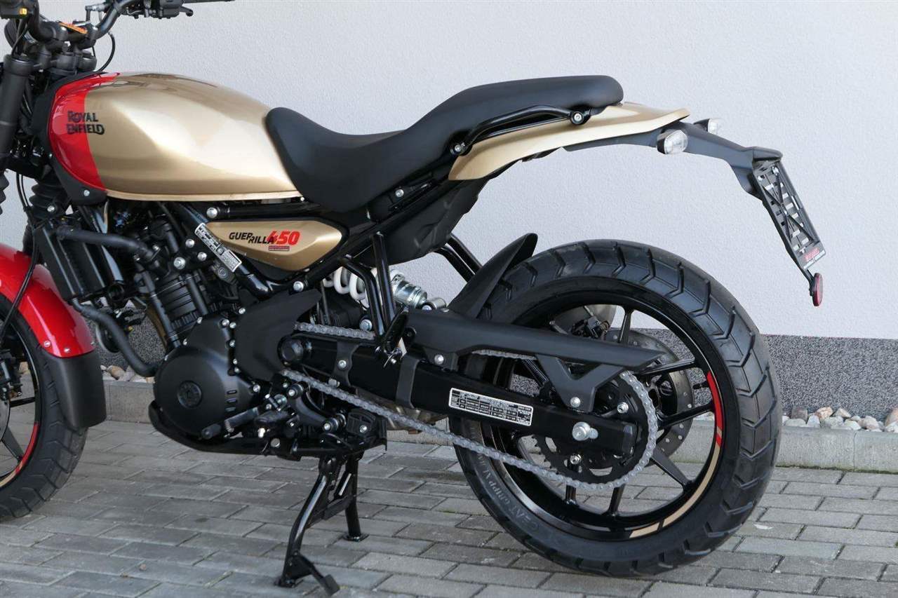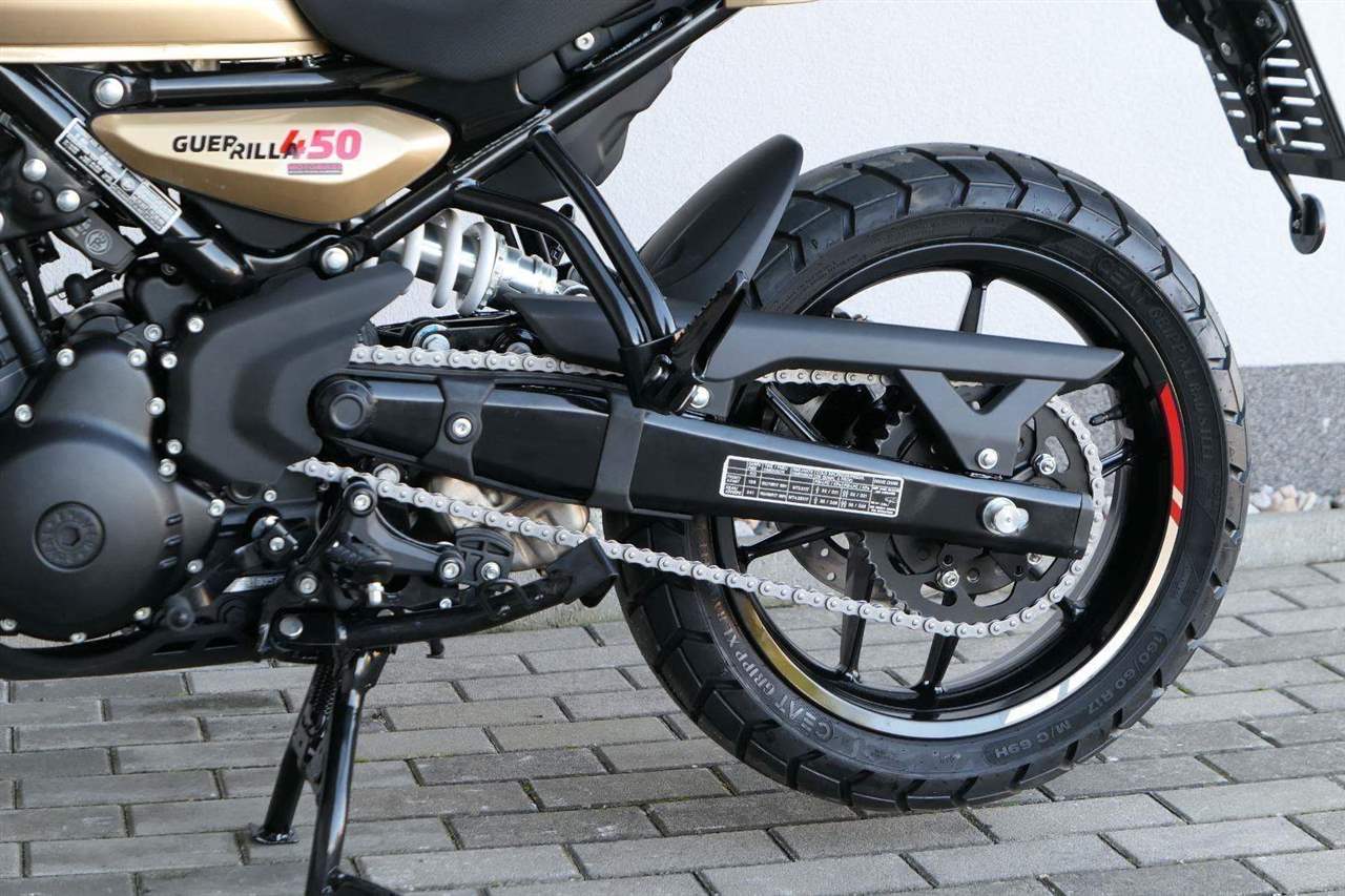 Z dosavadní modelové řady má Guerilla nejblíž Hunteru, působí ale moderněji a má i výrazně modernější techniku. Tak jako u aktuálního silnějšího Himalayanu 450 tvoří základ motorky trubkový páteřový rám, a v něm jako nosný prvek kapalinou chlazený jednoválec Sherpa o objemu 452 cm3. Relativně nový čtyřventil je mnohem výkonnější jednotkou než starší a menší vzduchem chlazené agregáty. Konkrétně nabídne rovných 40 koní v 8 000 otáčkách, a aby se to dobře pamatovalo tak i 40 Nm, které vrcholí v 5 500 otáčkách. Motor už má elektronický plyn a díky tomu i volitelné jízdní režimy – je ale poměrně jasné, který z dvojice „Eco“ a „Performance“ drtivá většina jezdců zvolí.