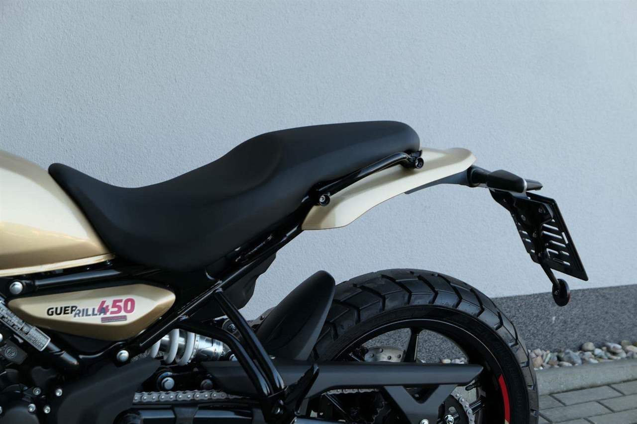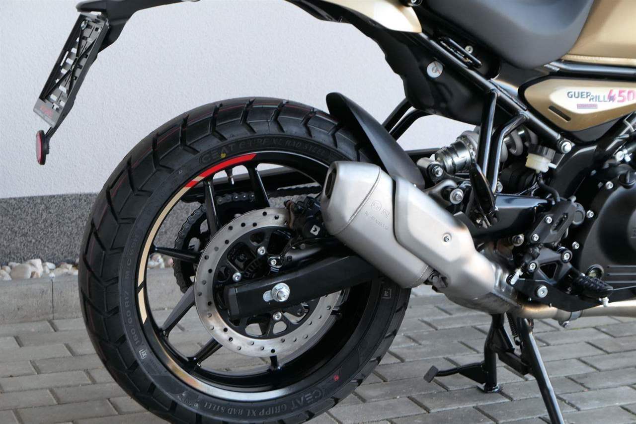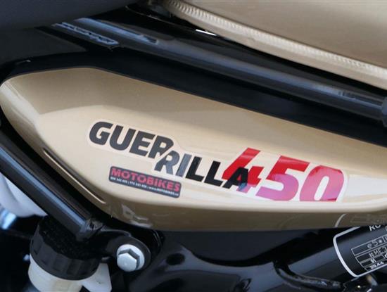Kola jsou sedmnáctipalcová a Guerilla se chlubí přístupnou výškou sedla 780 milimetrů, stejně jako příjemnou pohotovostní hmotností 184 kilogramů. S ohledem na výkon a hmotnost jsou celkem dostačující i brzdy – vpředu jeden kotouč 310 milimetrů s dvoupístkovým brzdičem, vzadu 270 milimetrů s jednopístem. Do nádrže se vejde jenom skromných 11 litrů, na druhou stranu výrobce uvádí i skromnou tabulkovou spotřebu 3,39 litru na 100 kilometrů.