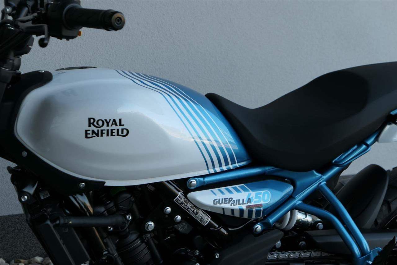 Z dosavadní modelové řady má Guerilla nejblíž Hunteru, působí ale moderněji a má i výrazně modernější techniku. Tak jako u aktuálního silnějšího Himalayanu 450 tvoří základ motorky trubkový páteřový rám, a v něm jako nosný prvek kapalinou chlazený jednoválec Sherpa o objemu 452 cm3. Relativně nový čtyřventil je mnohem výkonnější jednotkou než starší a menší vzduchem chlazené agregáty. Konkrétně nabídne rovných 40 koní v 8 000 otáčkách, a aby se to dobře pamatovalo tak i 40 Nm, které vrcholí v 5 500 otáčkách. Motor už má elektronický plyn a díky tomu i volitelné jízdní režimy – je ale poměrně jasné, který z dvojice „Eco“ a „Performance“ drtivá většina jezdců zvolí.