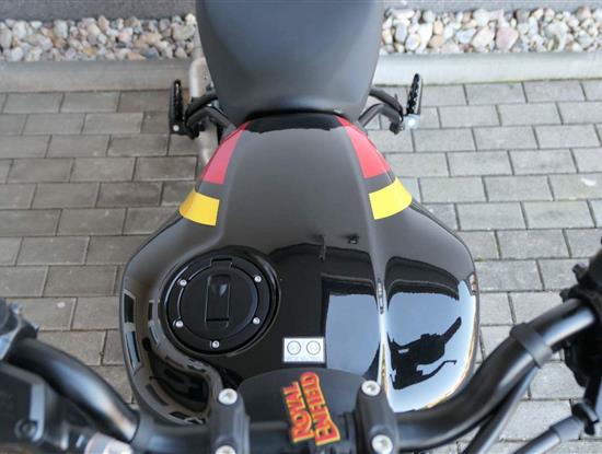 Celkově má Guerilla poměrně moderní tvary, Royal ale zdůrazňuje, že zde nejsou žádné nadbytečné plasty a serepetičky, a že jde v principu o jednoduchou a zábavnou motorku – což koneckonců spojuje všechny modely Royal Enfieldu. Opět je nutné pochválit výběr barev, který je vychytaný přesně tak, jak jsme u Royalu zvyklí. Z celkem pěti zbarvení je jenom jedno nudné, a sice jednolitá stříbrná Smoke Silver. Zbytek, tedy Brava Blue, Yellow Ribbon, Playa Black a Gold Dip zajímavě kombinují barevnou grafiku a ve třech případech dostanete i barevné ráfky.
