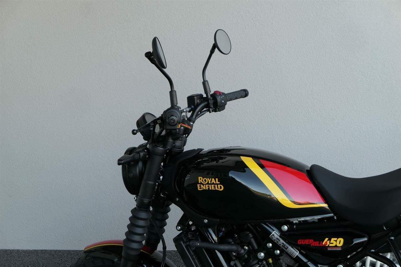 Z dosavadní modelové řady má Guerilla nejblíž Hunteru, působí ale moderněji a má i výrazně modernější techniku. Tak jako u aktuálního silnějšího Himalayanu 450 tvoří základ motorky trubkový páteřový rám, a v něm jako nosný prvek kapalinou chlazený jednoválec Sherpa o objemu 452 cm3. Relativně nový čtyřventil je mnohem výkonnější jednotkou než starší a menší vzduchem chlazené agregáty. Konkrétně nabídne rovných 40 koní v 8 000 otáčkách, a aby se to dobře pamatovalo tak i 40 Nm, které vrcholí v 5 500 otáčkách. Motor už má elektronický plyn a díky tomu i volitelné jízdní režimy – je ale poměrně jasné, který z dvojice „Eco“ a „Performance“ drtivá většina jezdců zvolí.