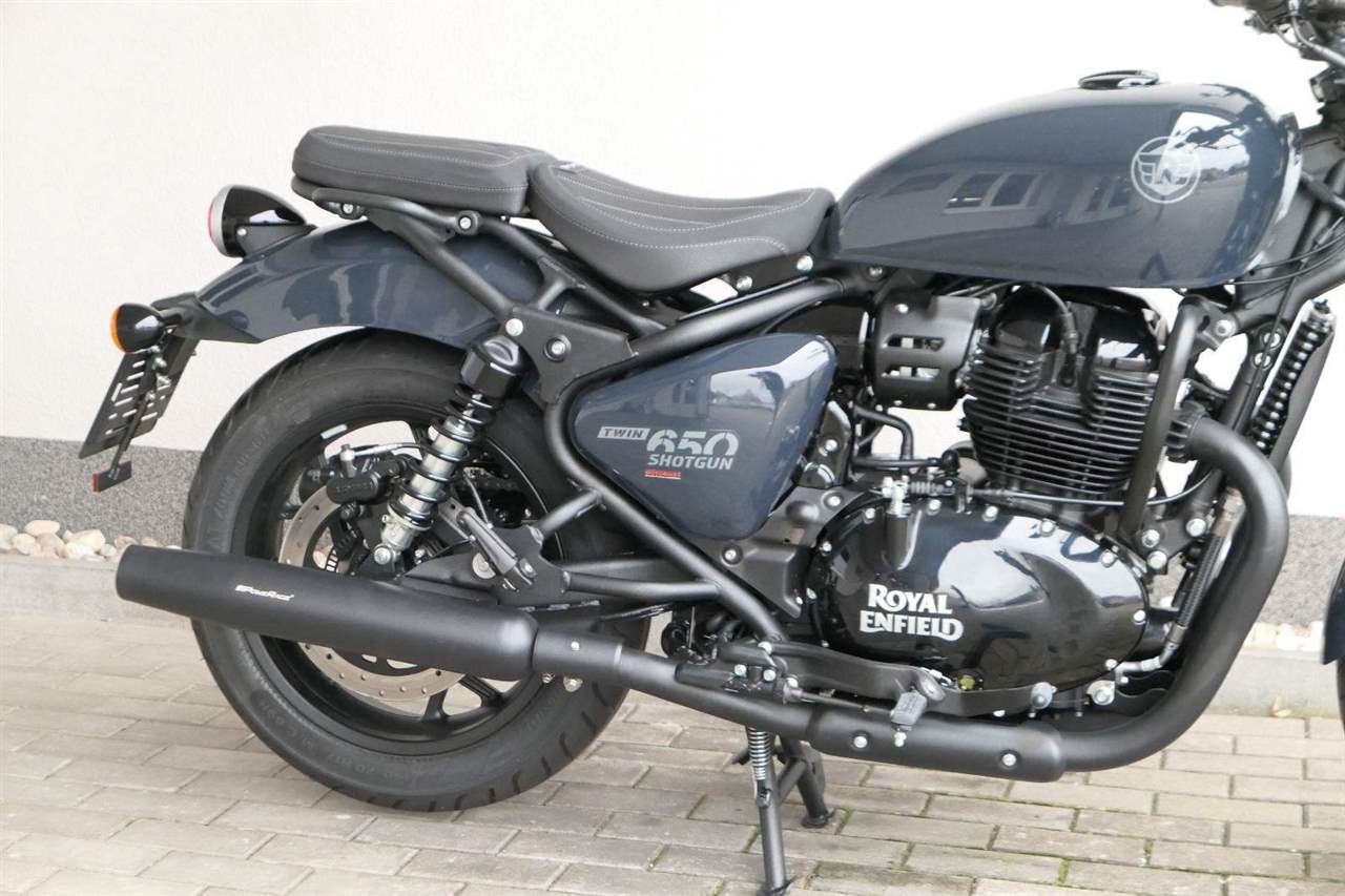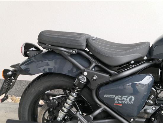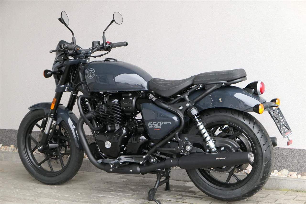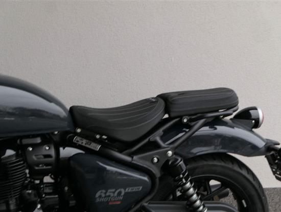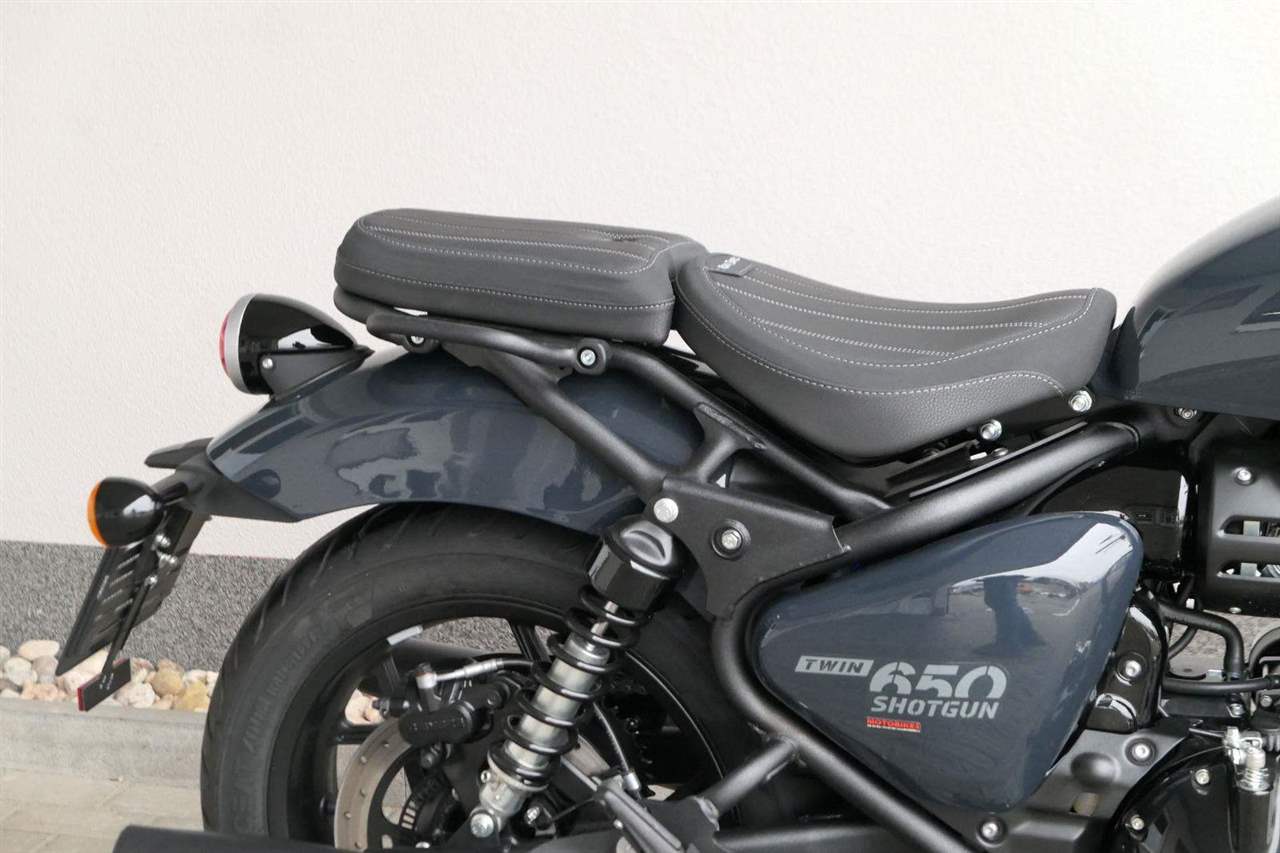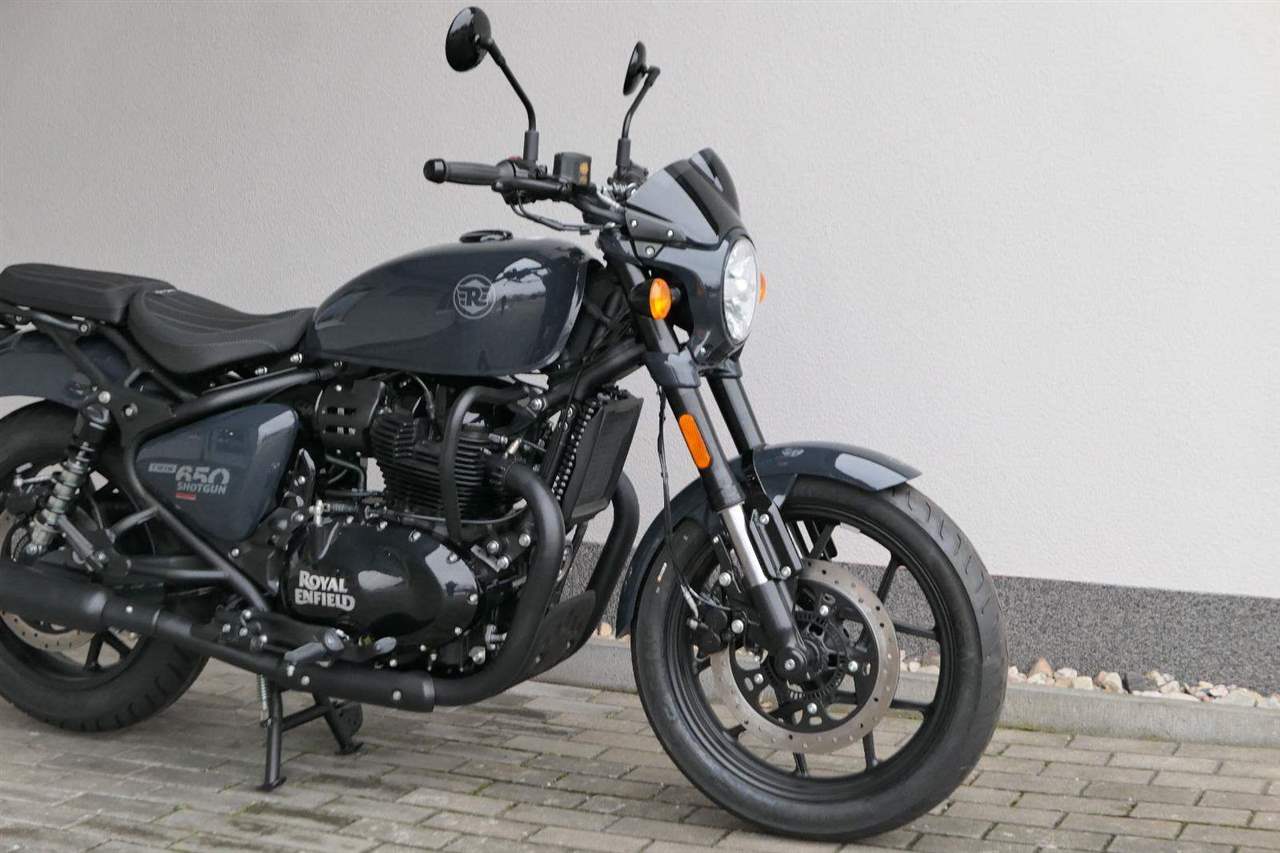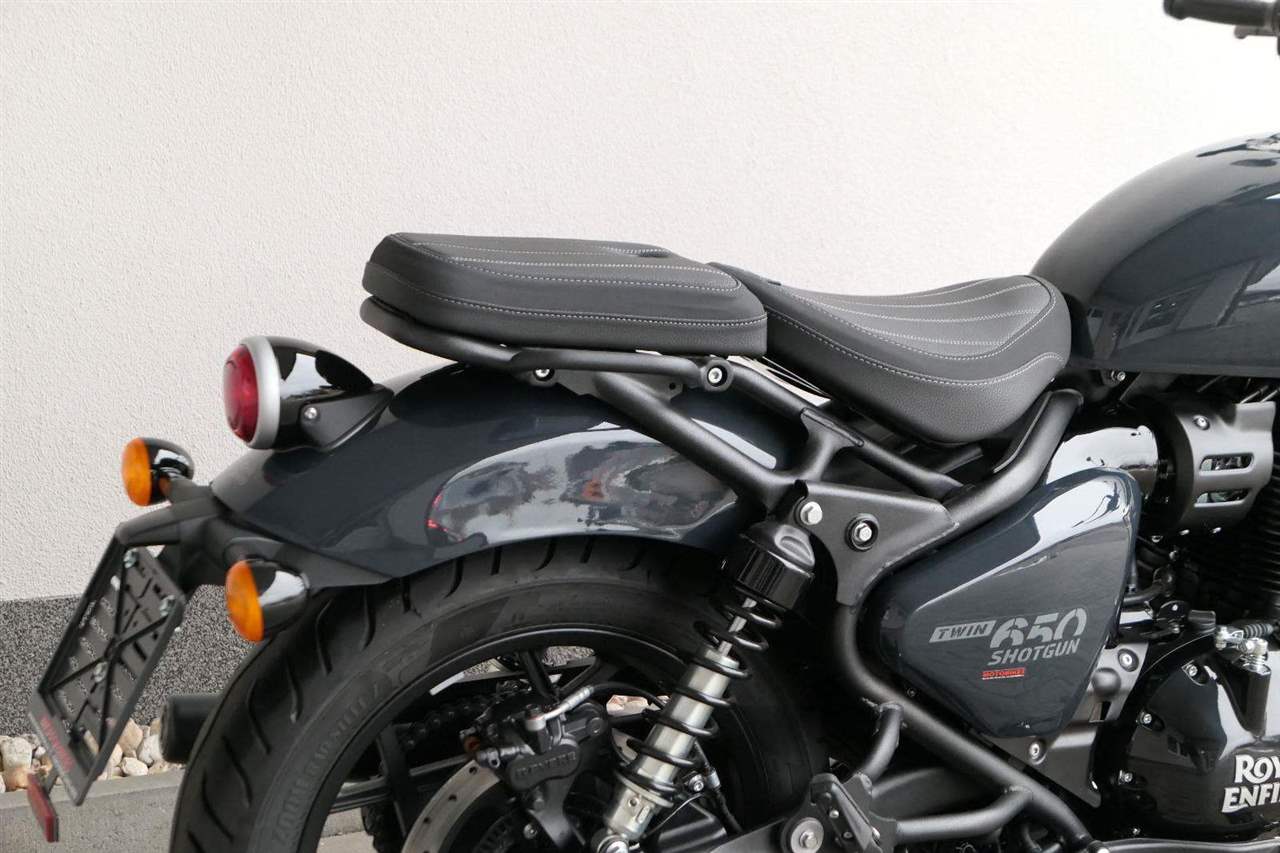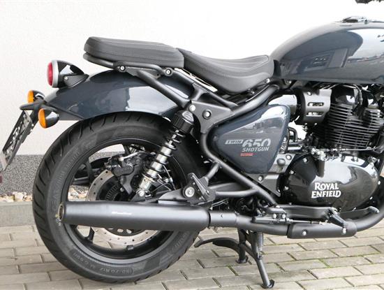 Nový Royal Enfield Shotgun 650 je motocykl, který je definován svým jezdcem. Jeho zcela nová karoserie a postoj jsou prázdným plátnem, které se vzpírá tradiční kategorizaci motocyklů a přebírá osobnost svého jezdce. Jeho modulární konstrukce umožňuje snadné přepínání mezi třemi režimy - od jednomístného přes dvoumístný až po cestovní vůz pro přepravu zavazadel. Otočením klíčku se odklopí sedadlo spolujezdce, což nabízí maximální flexibilitu. Těm, kteří hledají poutavou a agresivní jízdu, nebo těm, kteří hledají pohodovější zážitek, Shotgun 650 bez námahy vyhoví svou vzpřímenou a jistou jízdní pozicí, která podporuje obojí a přizpůsobuje se náladě a stylu jízdy jezdce. Kombinuje retro-futuristický design s moderními prvky. LED světlomet umístěný v nádherné neomoderní gondole na zakázku zůstává věrný estetice neo-retro fúze a zároveň nabízí lepší viditelnost. Motocykl je vybaven digitálně-analogovým sdruženým přístrojem, který je vybaven navigačním systémem Tripper a je navržen tak, aby poskytoval všechny informace, které potřebujete, když se vydáte na cestu. Je také vybaven nabíjecím portem USB, abyste měli svá zařízení na cestách stále nabitá.