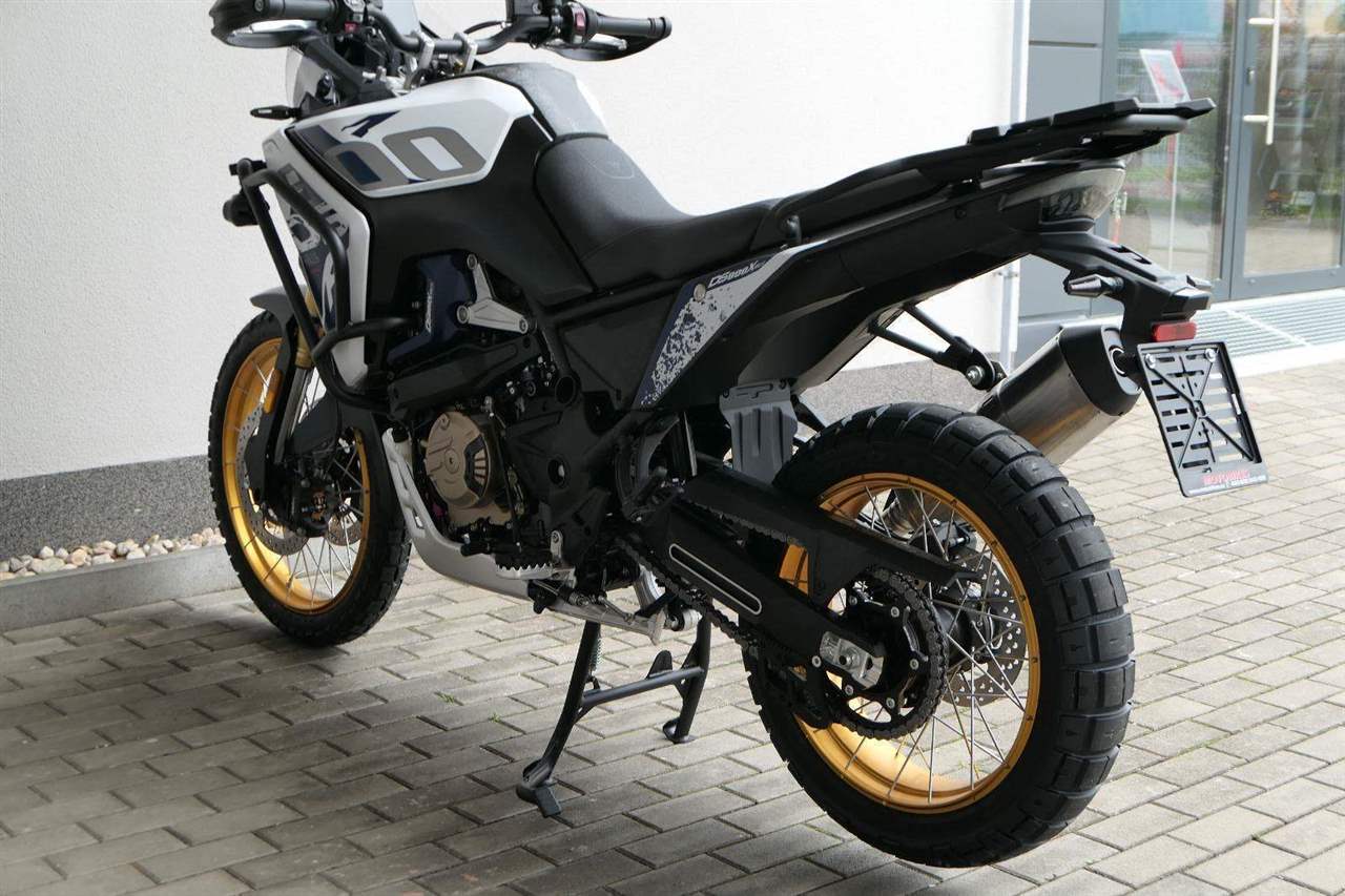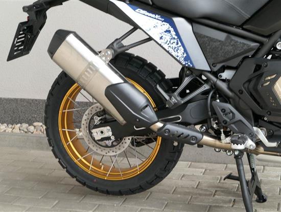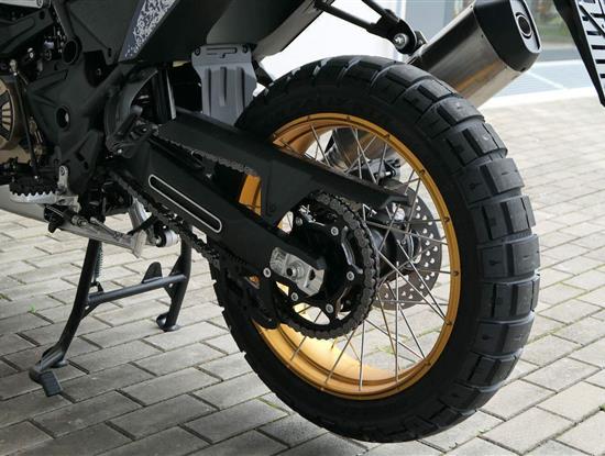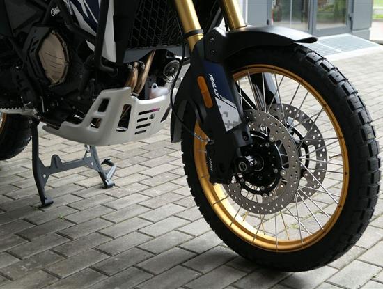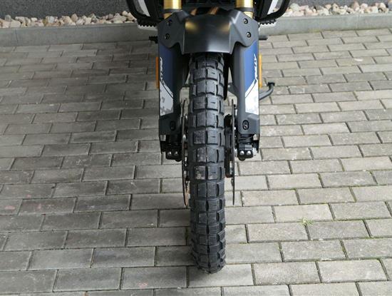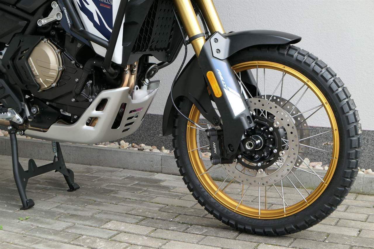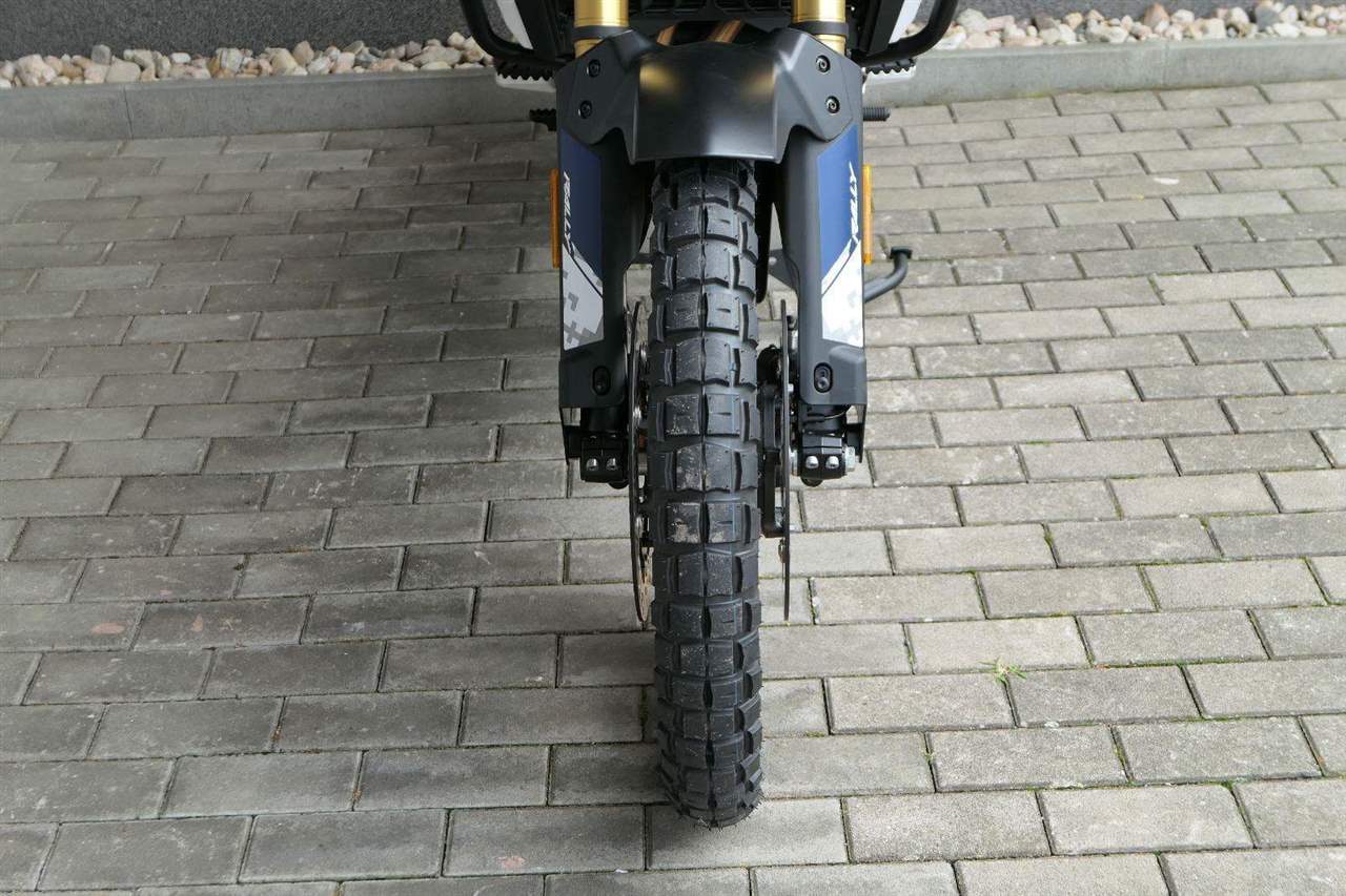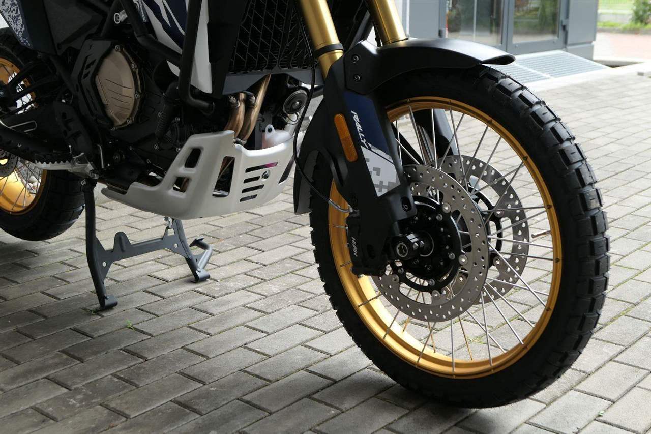 Vpředu najdeš jednadvacítku, vzadu osmnáctku – prostě offroad klasika. Kola jsou samozřejmě drátový a bezdušový. Na ráfkách dostaneš gumy Pirelli Scorpion Rally STR, který si hravě poraděj jak s asfaltem, tak s terénem.