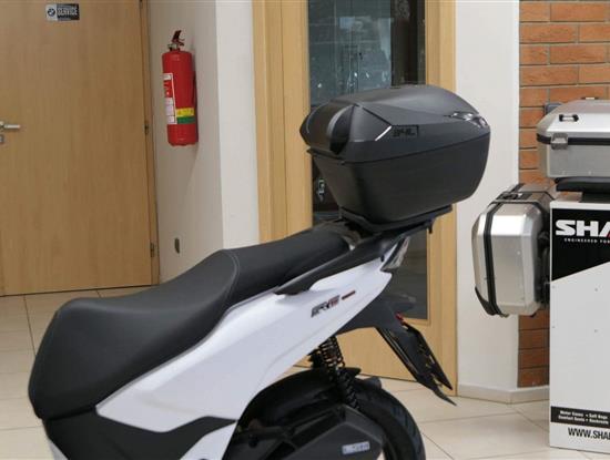 Pod sedlo hodíš běžnej nákup, případně jetku nebo menší integrálku. A kdybys vyrazil na větší nákup, už v základu dostaneš zadní hliníkovej nosič s 34litrovým kufrem. Drobnosti si schováš do uzavíratelný přihrádky s USB, kterou mám v předním štítu.