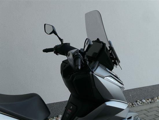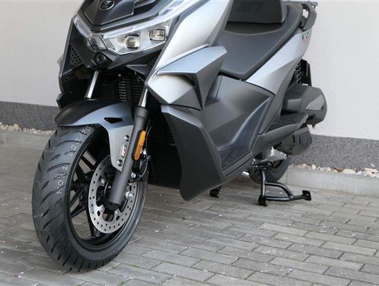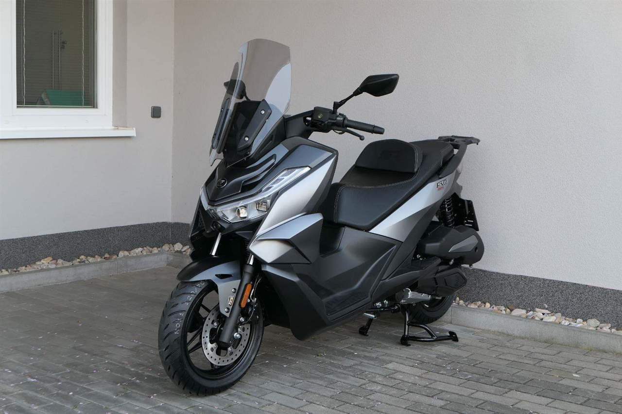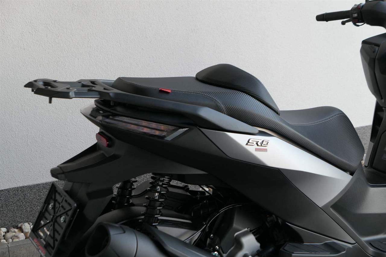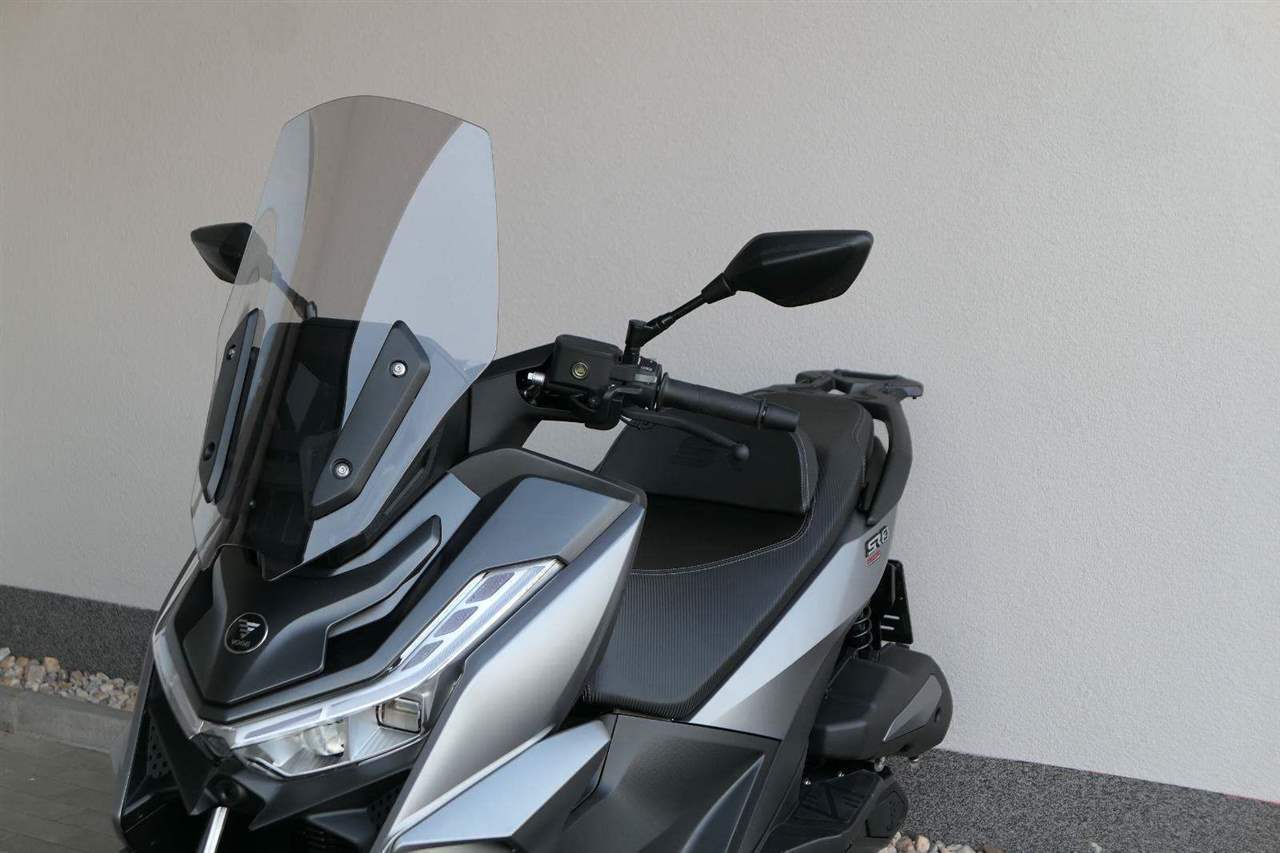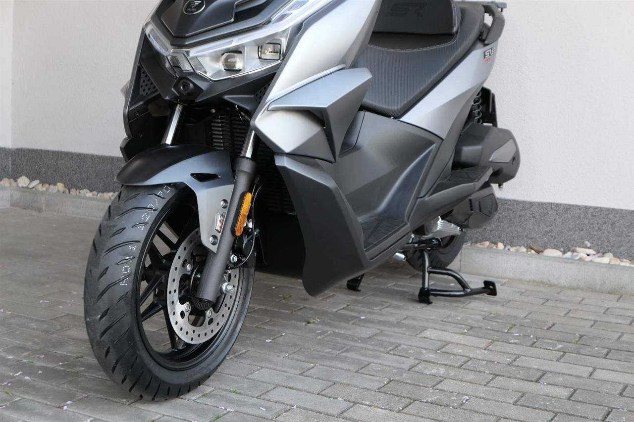 K tomu integrovaná palubní kamera s detektorem nárazu, kterej automaticky uloží záznam při nehodě. Elektrika je fajn, ale při brzdění spolíhám na starý dobrý železo, tedy dvoupístkový třmeny a kotouče. Ten vpředu má průměr 260 mm, zadní 240 mm. Na skútr slušný, co říkáš?